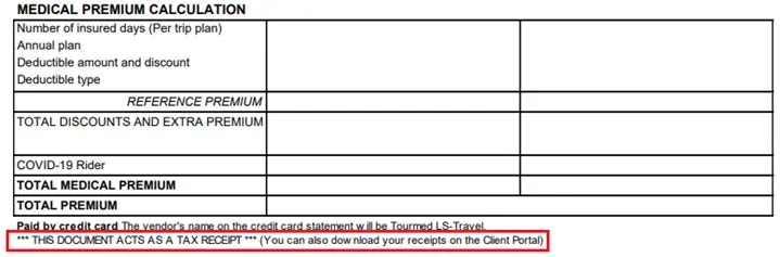 To calculate this in your medical expenses, you must have proper documentation. At Tour+Med, we stopped providing a document entitled “tax receipt” since it was an additional page in an already voluminous document, but mostly because all the necessary information can be found on page 1 of your Travel Insurance Confirmation. You will see a note to that effect beneath the Medical Premium Calculation chart :