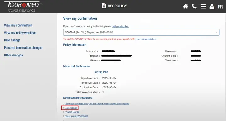 By experience, we know a travel insurance policy can be modified many times, due to a change in your medication or to your trip dates, for example. The premium you finally paid could differ from the one presented on your Travel Insurance Confirmation. If that’s your case, you’re invited to use the Client Portal to download the receipt showing the official premium paid for your policy, after modifications.