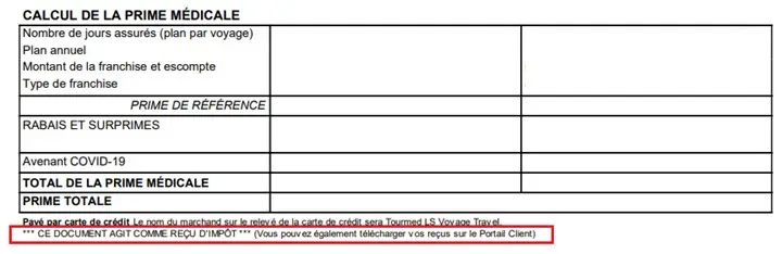 Pour pouvoir soumettre cette dépense médicale, vous devez avoir en main la documentation nécessaire. Chez Tour+Med, nous avons cessé de fournir un document intitulé « reçu d’impôt » puisqu’il s’agissait d’une page supplémentaire à un document déjà bien garni, mais surtout parce que toutes les informations nécessaires se trouvent à la page 1 de votre Confirmation d’assurance voyage. Vous verrez d’ailleurs une note à cet effet au bas du tableau « Calcul de la prime médicale » :
