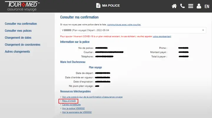 Par expérience, nous savons qu’une police d’assurance voyage peut être modifiée plusieurs fois, en raison d’un changement à votre médication ou à vos dates de voyage, par exemple. La prime réellement payée pour votre police pourrait donc être différente de celle affichée sur la Confirmation d’assurance voyage. Si c’est votre cas, nous vous invitons à utiliser le portail client afin d’obtenir le reçu qui concorde avec la prime réellement payée pour votre police, après modifications.
